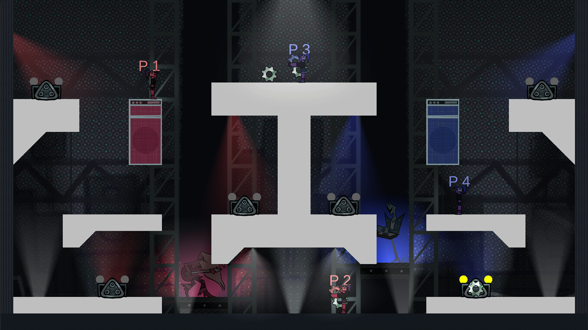Fight Song is a 2v2 platforming game, created in under 48 hours for Global Game Jam 2020. Players take the role of roadies back stage at a battle-of-the-bands concert, and are tasked with repairing their team's performer lift to get their soloist on stage first. There's a limited number of spare parts (cogs) to keep the lifts running, so players must fight over them to keep their lift moving faster.